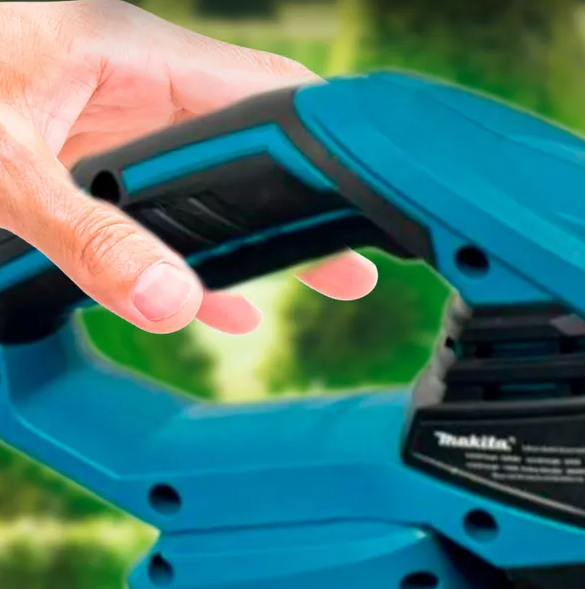 Обрезиненное покрытие рукояток гарантирует надежный хват и комфортное использование в течение длительного времени. Контроль пользователя обеспечивается выключателями привода на обеих рукоятках, что позволяет безопасно управлять инструментом обеими руками. Защитный козырек предотвращает попадание срезанных веток на пользователя.